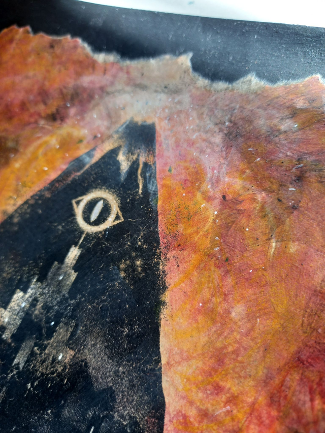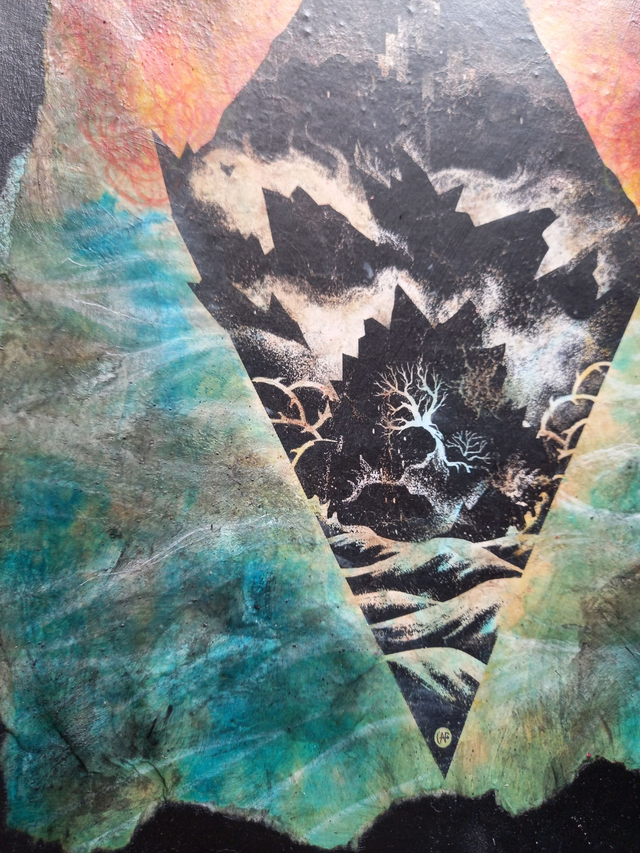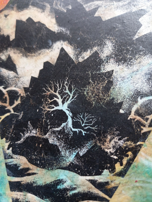A print-paint combo, with acrylic, white ink, charcoal and watercolour.