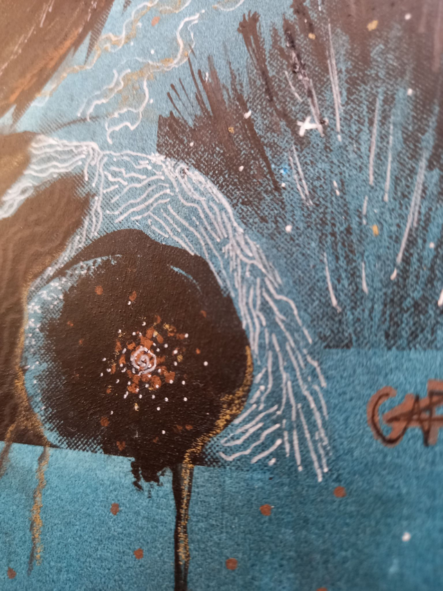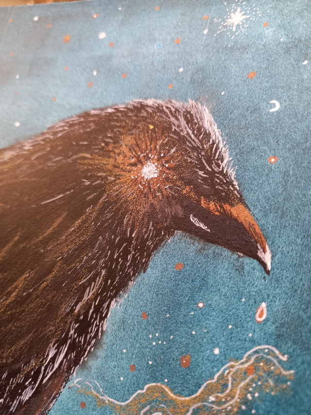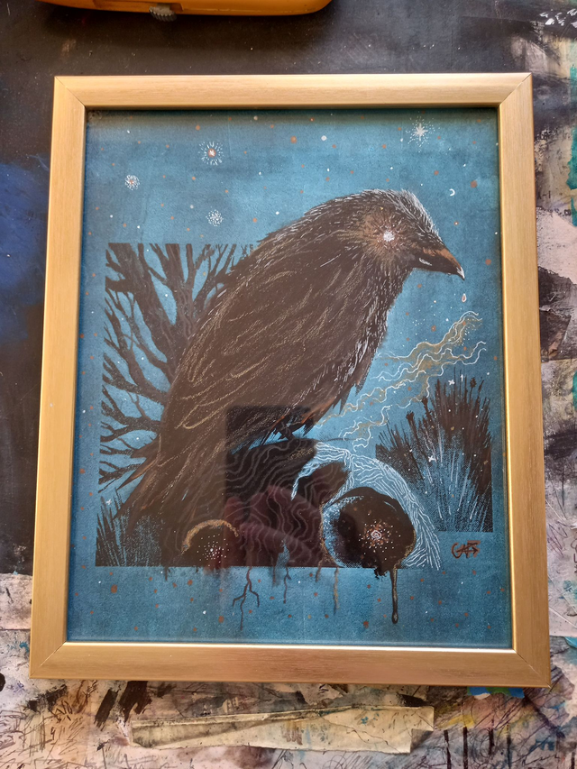 This is a framed print layered with drawing in graphite, gold, bronze crayon & white ink. Approx 8.5 x 10.5" including frame with acrylic, not glass.